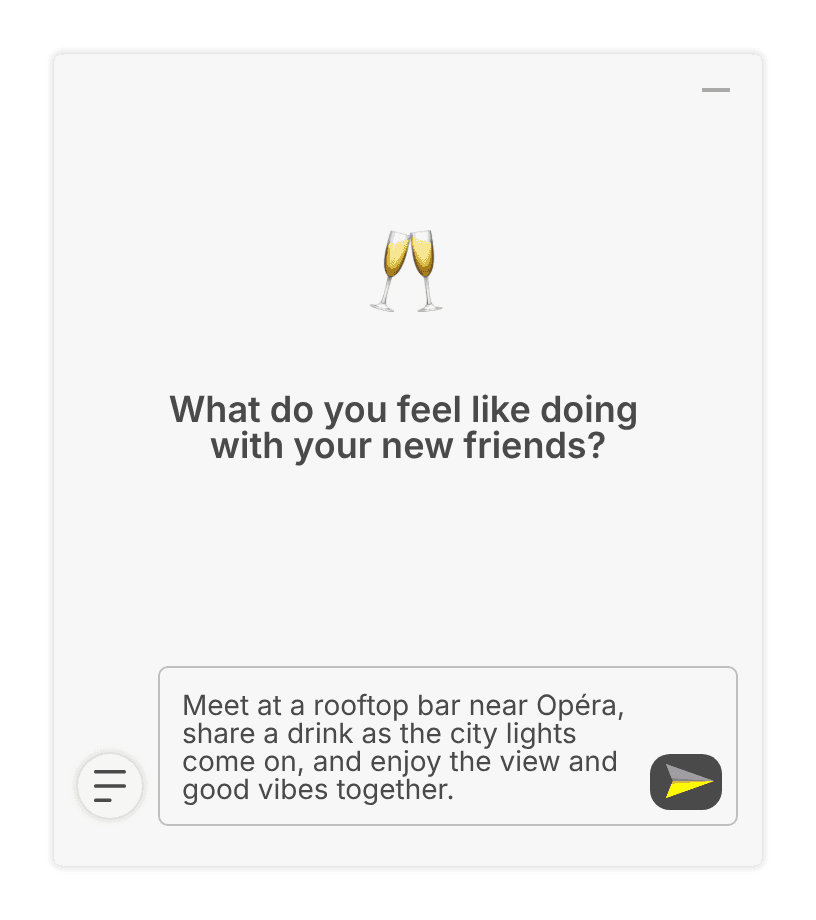 Tell Viberize what you want to do, when you’re free, and who you’d like to join. We’ll help you find the perfect match and turn plans into real moments.